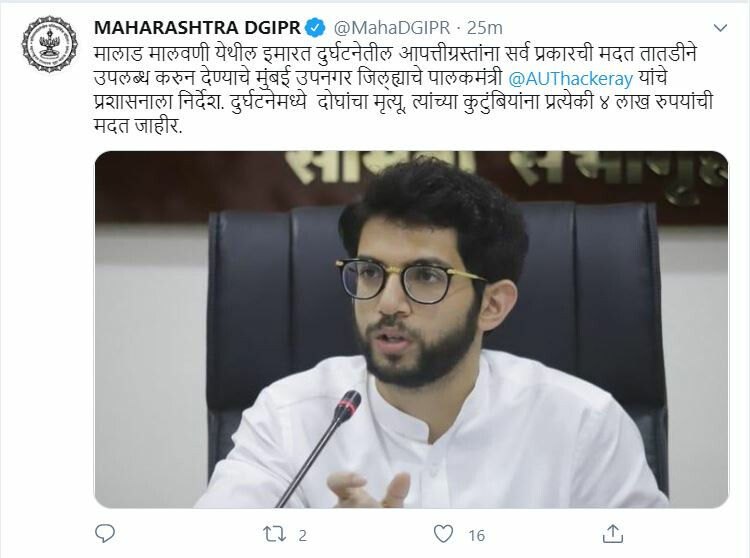 इस संबंध में जानकारी देते हुए, आदित्य ठाकरे (Aaditya thackeray) ने कहा कि प्रशासन को निर्देश दिया गया है कि वह मलाड, मालवणी में हादसे के पीड़ितों को तुरंत सभी प्रकार की सहायता प्रदान करें। इस हादसे में दो लोगों की मौत हो गई है। मृतकों के परिवारों को चार-चार लाख रुपये की सहायता राशि की घोषणा की जा रही है।