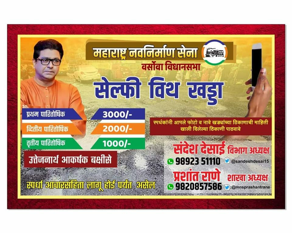 मुंबई में सड़को पर खड्डे पड़ने का मुद्दा काफी पुराना है। कई बार लोगों ने सड़को पर पड़े खड्डों को लेकर बीएमसी और शिवसेना पर निशाना साधा है। राज्य में चुनाव नजदीक है और इसे देखते हुए एक मुंबई के सड़को पर पड़े खड्डो का मुद्दा एक बार फिर से डोर पकड़ता जा रहा है। अंधेरी के वर्सोवा इलाके में मनसे कार्यकर्ताओ ने 'सेल्फी विथ खड्डा' मुहिम की शुरुआत की है। इस मुहिम के तहत जो व्यक्ति खड्डो के साथ सबसे अच्छी सेल्फी खिचेगा उसे कैश इनाम दिया जाएगा।