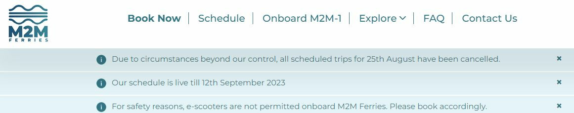 मुंबई से अलीबाग रो रो फेरी सर्विस को आज 25 अगसत् के लिए दिनभर के लिए बंद कर दिया गया है। M2M कंपनी ने अपनी अधिकारिक बेवसाईट पर इसकी जानकारी दी है। फिलहाल एम2एम फेरीज ने अलीबाग से मुंबई और मुंबई से अलीबाग तक सुबह 9:45 बजे से शाम 4:30 बजे तक फेरी सर्विसे देती है। (Mumbai Alibaug Ro Ro scheduled trips for August 25 have been cancelled)