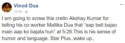 पोस्ट में विनोद दुआ ने लिखा है की "मैं इस बेवकूफ अक्षय कुमार का पेंच कसने जा रहा हूं जो अपनी को-वर्कर मल्लिका दुआ से कहता है, 'आप बेल बजाओ मैं आपको बजाता हूं। यही उसका सेंस ऑफ ह्यूमर और भाषा है।' हालांकी एक वेबसाईट की खबर के अनुसार बाद में विनोद दुआ ने इस पोस्ट को अपने अकाउंट से हटा लिया।