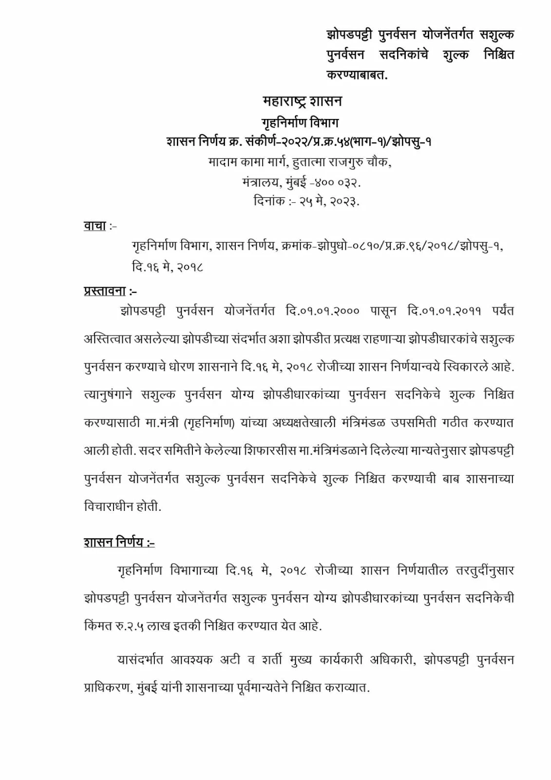 राज्य सरकार ने 2000 से 2011 तक झुग्गी झोपड़ी मे रहनेवालो को भी SRA स्किम के तहत घर देने का फैसला किया है। इस हालांकी इसके लिए झोपड़पट्टी धारको को एक शुल्क भरना होगा। सरकार ने सशुल्क पुर्नविकास की निती को मंजूरी दे दी है। (Mumbai Slum dwellers will also get houses in SRA from 2000 to 2011)