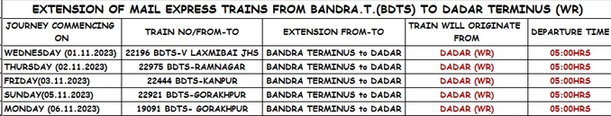 इसके साथ ही रेलवे ने 26 अक्टूबर से 06 नवंबर 2023 तक खार रोड और गोरेगांव स्टेशन के बीच छठी लाइन के लिए एनआई कार्य के कारण मूल रूप से बांद्रा टर्मिनस से प्रस्थान करने वाली निम्नलिखित मेल एक्सप्रेस ट्रेनें दादर टर्मिनस (western railway) तक चलाने का फैसला किया। (Mumbai These local trains on Western railway Line canceled on 2nd November)