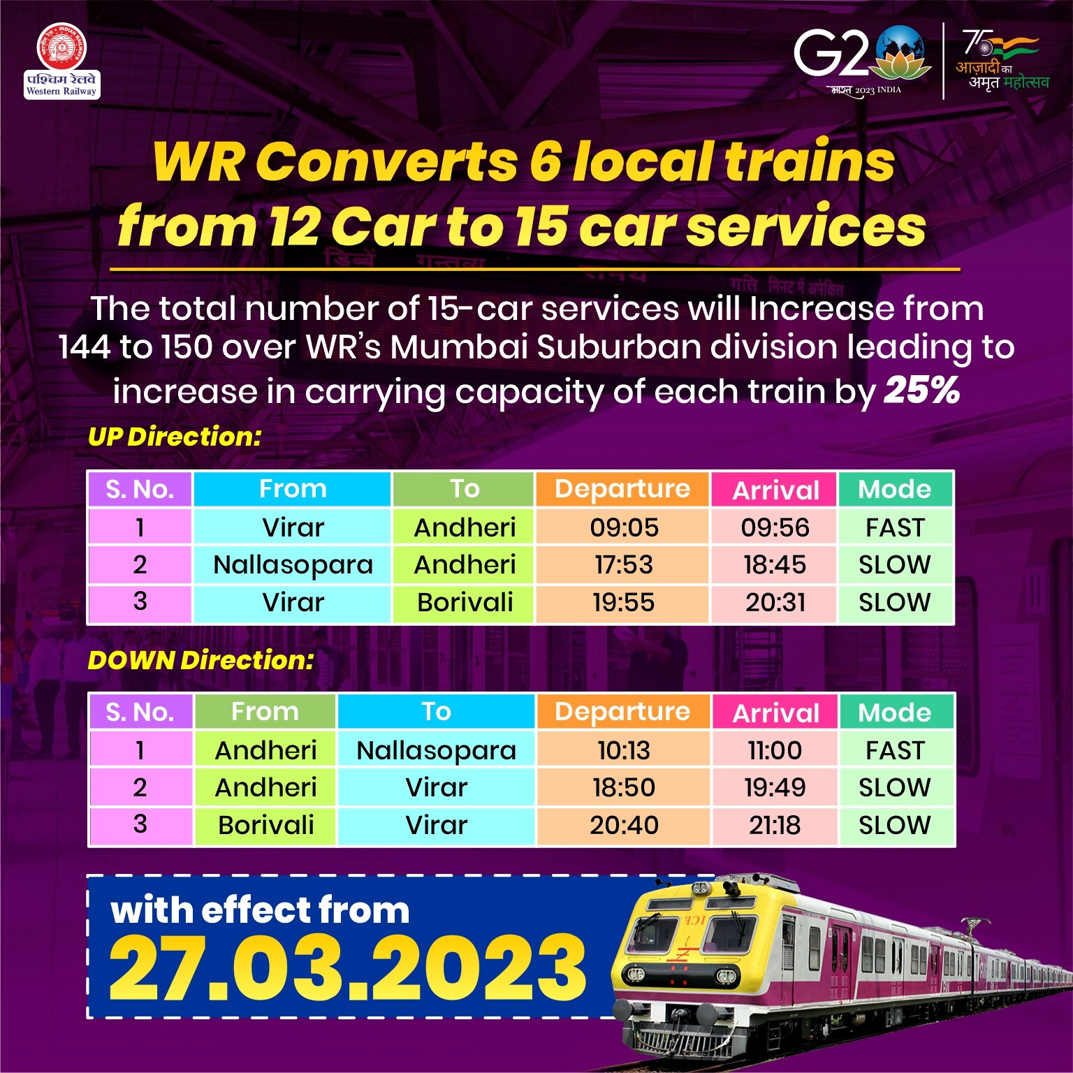 पश्चिम रेलवे ने 27 मार्च 20230 से 6 और 12 डिब्बों की लोकल ट्रेन सेवाओं को 15 डिब्बों की सेवाओं में परिवर्तित किया है। (Mumbai Western Railway will have 6 more local trains of 15 coaches from March 27)
