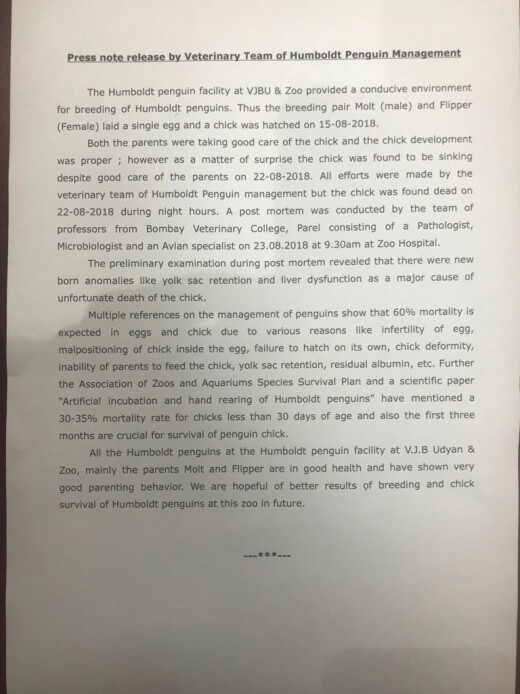 मुंबई के जीजामाता उद्यान यानि रानी बाग़ में 15 अगस्त बुधवार को जन्मे मादा पेंग्विन के बच्चे की मौत हो गयी। आपको बता दें कि 26 जुलाई 2016 को दक्षिण कोरिया से आठ हम्बोल्ट पेंग्विन मंगाए गए थे। इन्हीं में से एक जोड़े ने पिछले महीने जुलाई में यहां अंडा दिया था। और करीब 40 दिन बाद यह नन्हीं पेंग्विन का जन्म हुआ था।