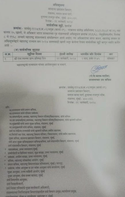 अयोध्या में राम मंदिर के उद्घाटन के अवसर पर सोमवार 22 जनवरी को महाराष्ट्र राज्य द्वारा सार्वजनिक अवकाश घोषित किया गया है। (public holiday declared by Maharashtra state on Monday January 22 on the occasion of Ram Temple)