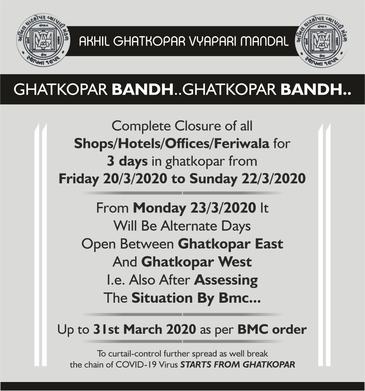बीएमसी ने भी भीड़भाड़ वाली जगहों को कम करने के लिए दुकानों को बंद रखने का गैर जरूरती दुकानों को बंद रखने की अपील की है जिसे देखते हुए अखिल घाटकोपर व्यापारी मंडल ने शुक्रवार 20 मार्च से लेकर रविवार 23 मार्च तक इलाके में हर तरह की दुकान को बंद रखने का फैसला किया है। इनमे दुकान, होटल , आफिस एयर फेरीवाले भी शामिल है। वहीं सोमवार से अल्टरनेट डे यानी कि ओड और इवन तारीखों पर दुकान शुरू रहेगी वो भी बीएमसी के साथ चर्चा करने के बाद। हालांकि इस दौरान मेडिकल स्टोर, मिल्क स्टोर ,किराना की दुकान और सब्जियों की दुकानें खुली रहेंगी।