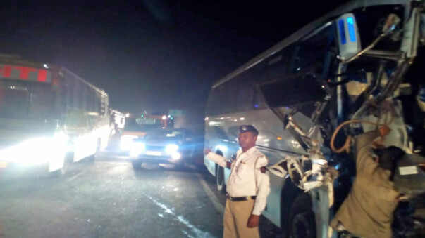 मिली जानकारी के मुताबिक बस जैसे ही अहमदनगर के केडगांव बाईपास पर स्थित नील होटल के सामने पहुंची वैसे ही बस की जोरदार टक्कर एक कंटेनर से हो गयी। यह टक्कर इतनी जोरदार थी कि बस के अगले भाग के परखच्चे उड़ गए।