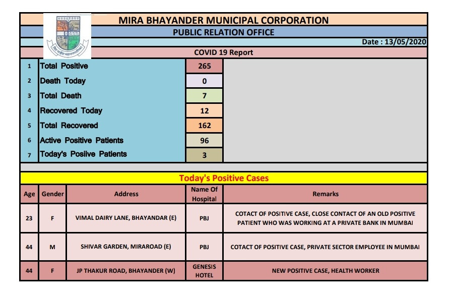 इन तीन नए कोविड-19 मामलों के साथ मीरा भायंदर में यह टोटल संख्या 265 पहुंच गई है। जिनमें से 162 लोग रिकवर हो चुके हैं। साथ ही 7 लोगों की मौत हो चुकी है, जोकि दुखद है।