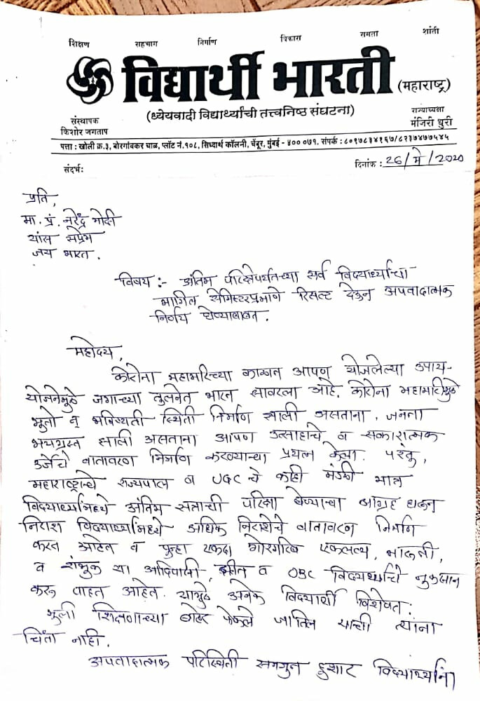राज्यपाल भगत सिंह कोश्यारी ने मुख्यमंत्री उद्धव ठाकरे को पत्र भेजकर राज्य विश्वविद्यालयों के अंतिम वर्ष के छात्रों के मुद्दे को हल करने का निर्देश दिया। तदनुसार, उच्च और तकनीकी शिक्षा विभाग ने कार्यवाही शुरू कर दी है, हालांकि विभिन्न छात्र संगठन परीक्षा रद्द करने पर अड़े हैं। विद्यार्थी भारती संघ ने यह भी मांग की है कि प्रधानमंत्री नरेंद्र मोदी परीक्षा रद्द करें। इस पत्र पर छात्रों ने अपने अंगूठे की खून की मुहर लगाई है।