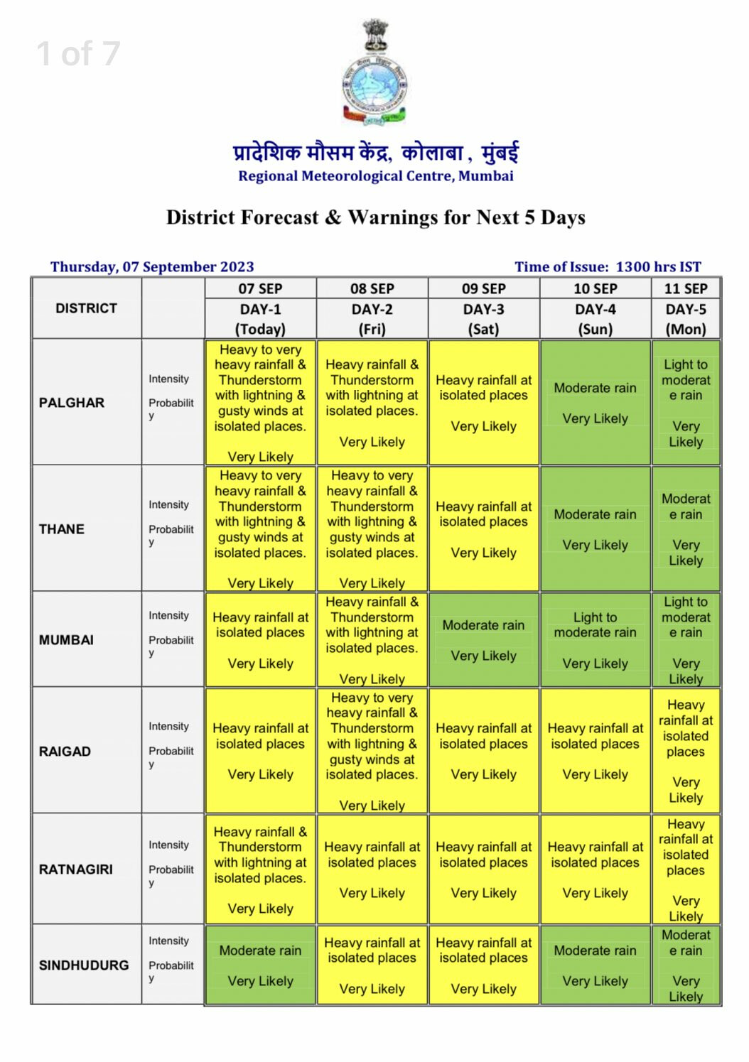 गुरुवार को मुंबई और ठाणे के साथ साथ रायगढ़ जिले में येलो अलर्ट जारी किया गया है, जो रविवार तक रहेगा। मौसम ब्यूरो ने रविवार को मुंबई के लिए येलो अलर्ट भी जारी किया है, जिसमें बिजली गिरने और तेज़ हवाओं के साथ आंधी आने की संभावना बताई गई है। (Mumbai rain updates)