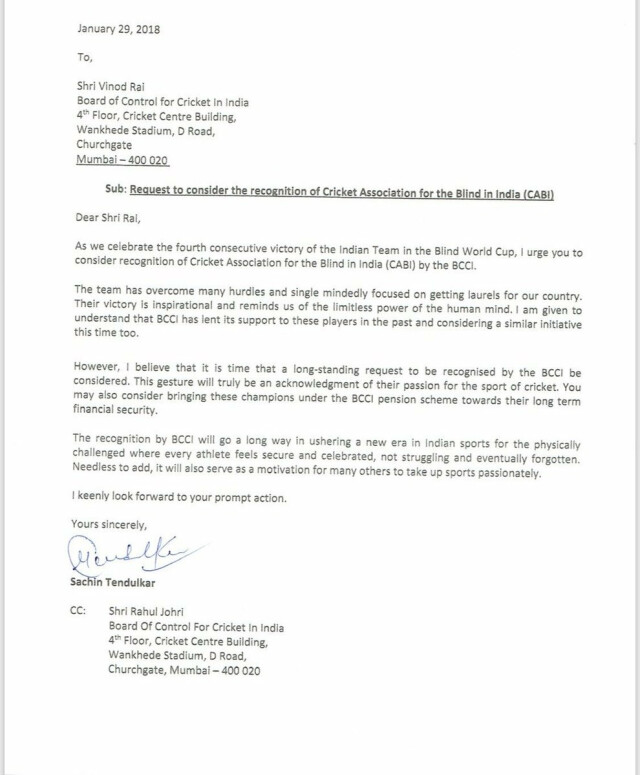 सचिन तेंदुलकर ने बीसीसीआई को भारतीय ब्लाइंड क्रिकेट एसोसिएशन (CABI) को मान्यता देने के लिए एक पत्र लिखा है। इसके साथ ही उन्होने बोर्ड की पेंशन स्कीम के अंदर लाने को भी कहा। प्रशासक कमेटी के चेयरमैन विनोद राय को सचिन तेंदुलकर ने एक पक्ष लिखकर ये मांग की है।