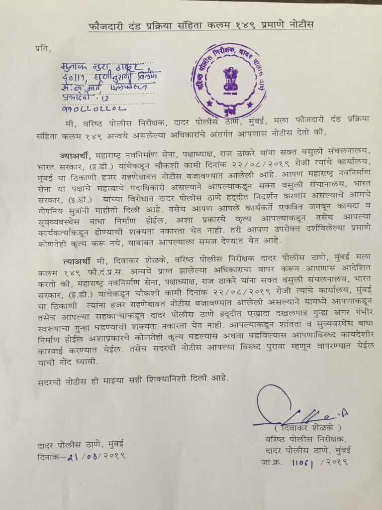 हालांकि राज ठाकरे ने ट्वीट कर मनसे कार्यकर्ताओं से ईडी के ऑफिस के बाहर जमा नहीं होने की अपील की थी, लेकिन किसी संभावित अनहोनी से बचने के लिए पुलिस एहतियातन मनसे के नेताओं को नोटिस भेज रही है।
