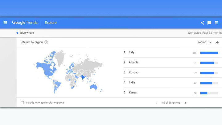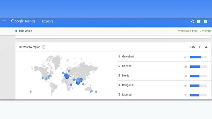 ब्लूवेल गेम जुड़ी वारदाते पिछलें कुछ महिनों से भारत में बढ़ी है। Google Trends की एक रिपोर्ट के मुताबिक पिछलें 12 महीनों भारत ने दुनिया में ब्लू व्हेल चैलेंज से संबंधित खोजों की सबसे बड़ी संख्या में देखा गया है। रूस में जन्मे इस जानलेवा ब्लू व्हेल चैलेंज ने अब भारत के कई युवाओं को धीरे धीरे अपनी चपेट में लेना शुरु कर दिया है। जो की एक बेहद ही खतरनाक संदेश है। इतना ही नहीं भारत पिछलें 3 महिनों से भारत में ब्लू व्हेल चैलेंज संबंधित सर्च में काफी बढ़ोत्तरी देखी गई है। जो बिल्कुल भी अच्छा संदेश नहीं है।
