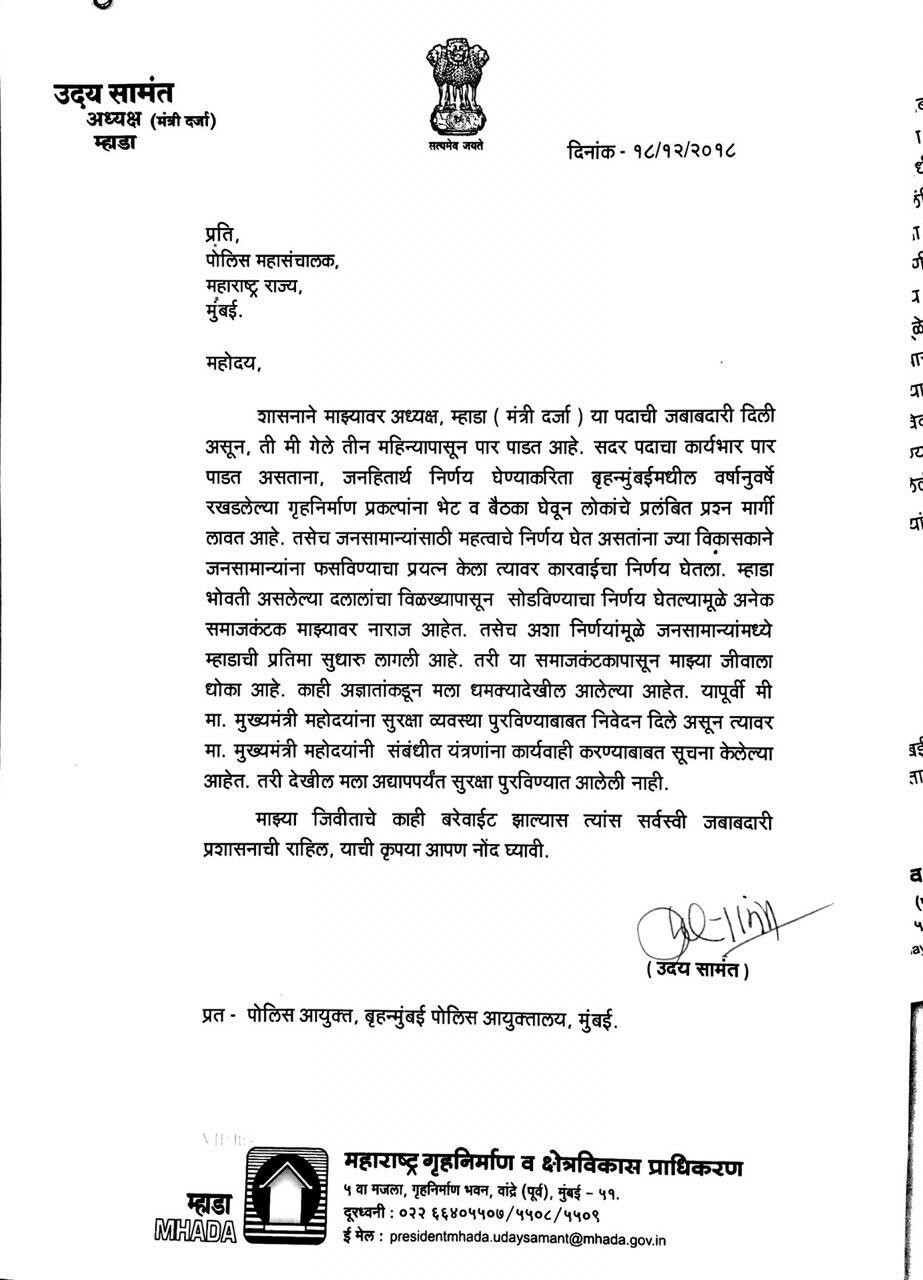 इस पत्र में उन्होने कहा है की अगर उनके साथ कुछ होता है तो राज्य इसके लिए जिम्मेदार होगा। सामंत रत्नागिरी से शिवसेना के विधायक हैं और उन्होने तीन साल पहले इस पद को संभाला था। मंत ने दावा किया कि चूंकि वह बिल्डरों के खिलाफ कार्रवाई कर रहे है जिससे म्हाडा की छवि में काफी सुधार हुआ है , लेकिन कुछ लोग इससे खुश नहीं है और सामंत को धमकी भरे कॉल आने लगे।