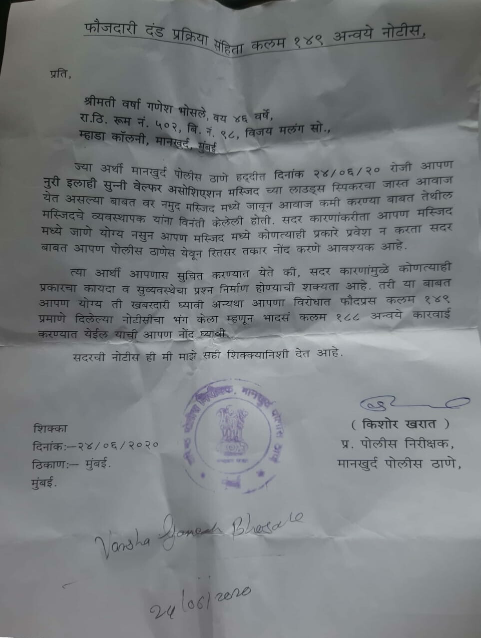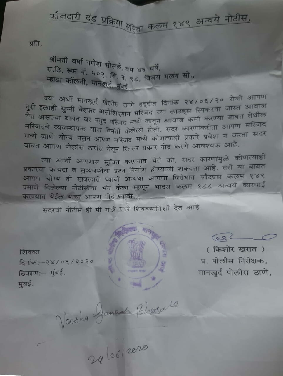 मानखुर्द इलाके में रहने वाली करिश्मा भोसले नामकी एक युवती ने मस्जिद में लगे लाउड स्पीकर की आवाज को पीड़ादायक बताते हुए उसके खिलाफ आवाज उठाई थी। करिश्मा ने मस्जिद में जाकर लाउड स्पीकर के आवाज को कम करने का निवेदन किया था, लेकिन करिश्मा की इस मांग को स्थानीय मुस्लिमों ने मानने से इनकार कर दिया था। जिसके बाद माहौल तनावपूर्ण हो गया था। इस मामले में पुलिस ने करिश्मा को धारा 149 के तहत नोटिस भेजा है और मस्जिद प्रशासन को आवाज कम करने का निर्देश दिया है।