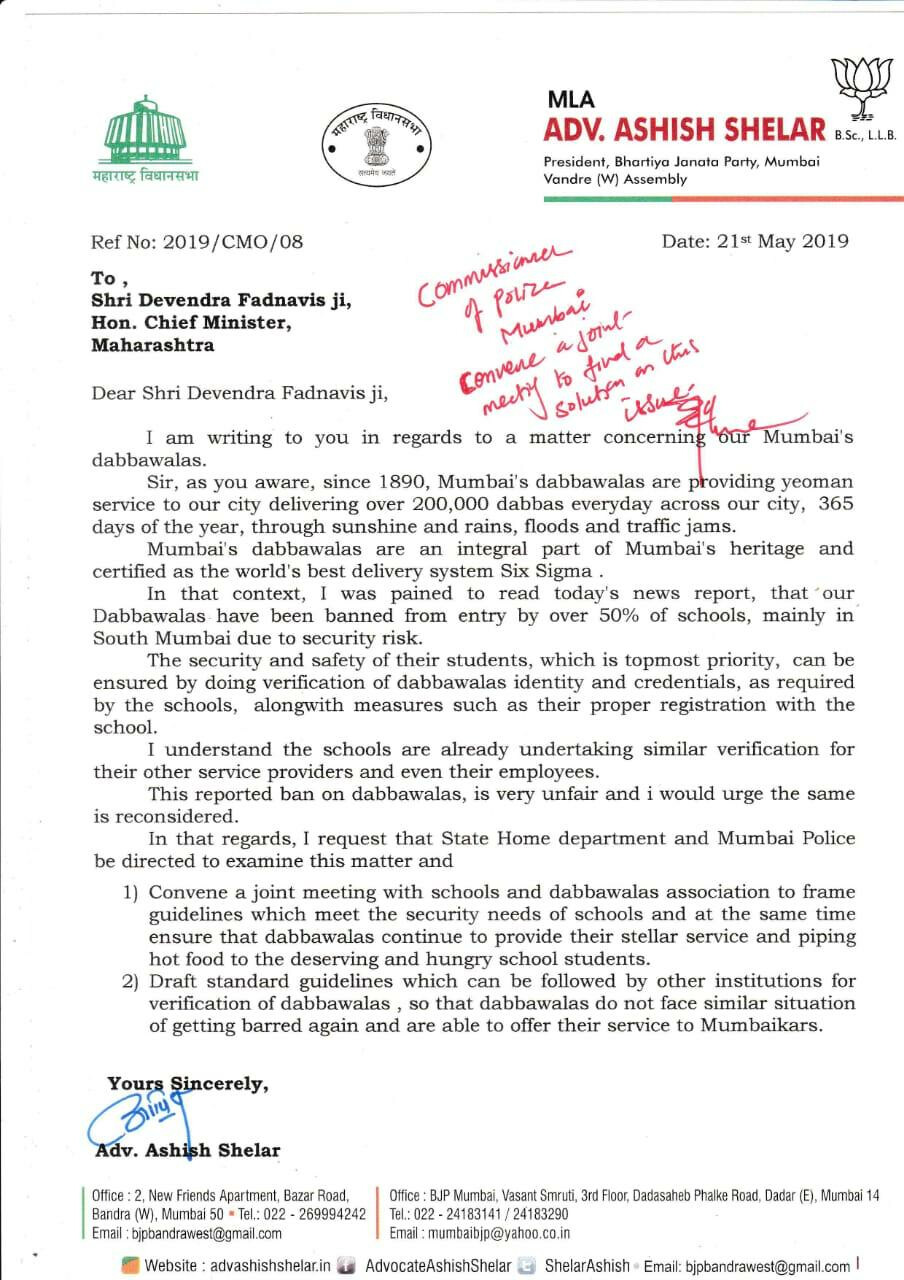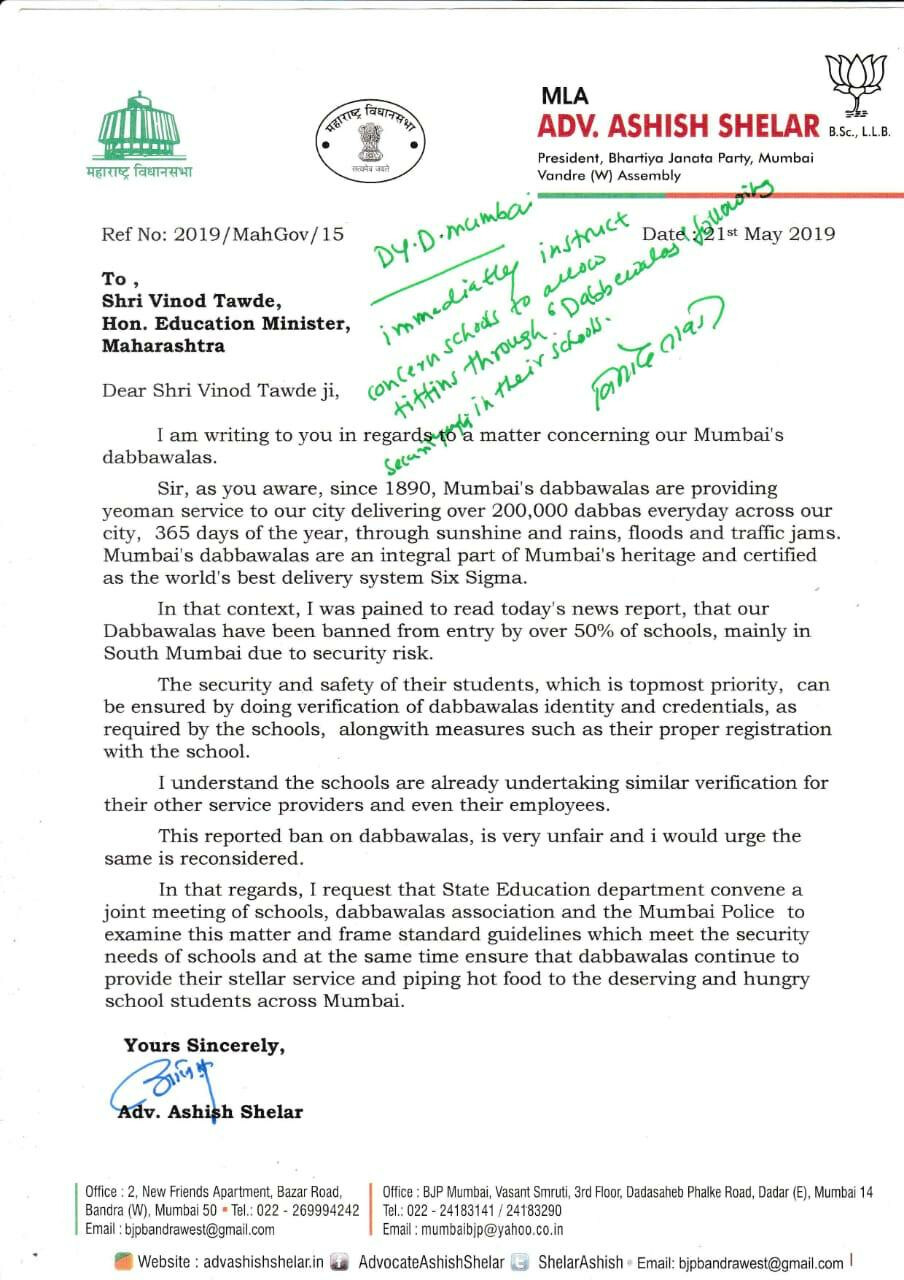 तलेकर आगे कहते हैं कि बच्चों को घर का खाना खाने में स्कूल कैसे विरोध कर सकते है। इस बारे में हमने मुख्यमंत्री देवेन्द्र फडणविस और शिक्षा मंत्री विनोद तावड़े को पत्र लिखा और उनसे स्कूलों द्वारा लगाईं गयी पाबंदी को हटाने की मांग की।आखिर यह डब्बे वालों के रोजगार का भी प्रश्न है। हमें आशा है कि बच्चों को उनेक घर का खाना खाने को जरुर मिलेगा।