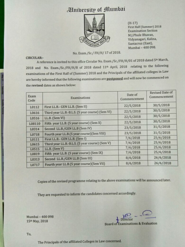 मुंबई विश्वविद्यालय ने जहां एक ओर मंगलवार को एलएलबी के दो सेमेस्टर के परीक्षा परिणाम को जाही किया तो वही दूसरी ओर बीएलएस -एलएलबी के परीक्षाओं की तारीख को भी आगे बढ़ा दिया है। दरअसल विश्वविद्यालय ने अभी तक एलएलबी के कई परिणाम निकाले नहीं है जिसके कारण विश्वविद्यालय ने लॉ की परीक्षा की तारीख को आगे बढ़ा दिया है।