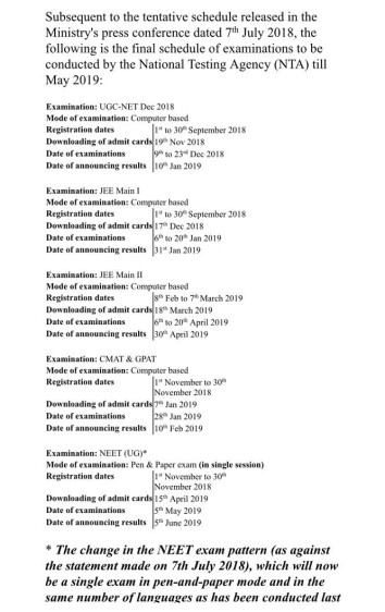 पहले NEET की परीक्षा को भी ऑनलाइन करने का ऐलान किया गया था लेकिन अब वह फिलहाल ऑफ लाइन यानी पेपर और प्रश्नपत्र के आधार पर ही होगा। NEET की परीक्षा अगले 2019 में 5 मई को आयोजित होगी और रिजल्ट 5 जून को जारी किया जायेगा।