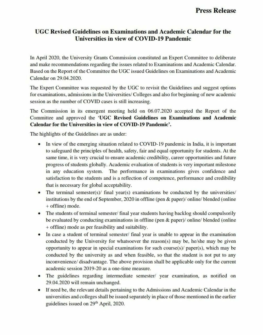 कोरोना के कारण कई बोर्ड और विश्वविद्यालय को अपमी मार्च और अप्रिल की परीक्षा रद्द करनी पड़ी है। हालांकी अब संसाधन विकास मंत्रालय का कहना है कि विश्वविद्यालय ऑनलाइन, ऑफलाइन या मिश्रित मोड में अंतिम वर्ष की परीक्षाएं आयोजित कर सकते हैं जिन्हे COVID के प्रकोप के कारण परीक्षण स्थगित कर दिए गए थे। युनिवर्सिटी ग्रांट कमिशन यानी की UGC ने कहा है की सितंबर के अंत तक विश्वविद्यालयों में अंतिम वर्ष की परीक्षाएं आोजित की जाएगी।