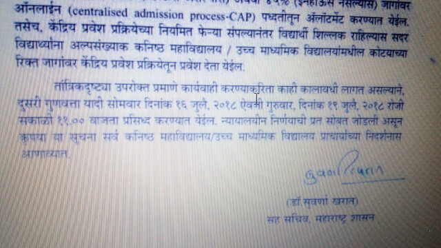 आज जारी होनेवाली FYJC की दूसरी लिस्ट अब 19 जुलाई को जारी की जाएगी। कुछ तकनीकी गड़बड़ियों के कारण इस लिस्ट की तारीख को आगे बढ़ाया गया है। 11 वीं ऑनलाइन प्रवेश प्रक्रिया की पहली गुणवत्ता सूची में 1 लाख 20 हजार 566 छात्र मुंबई में प्रवेश के लिए पात्र हुए जिनमें से 50 हजार 629 छात्रों ने अपना एडमिशन कंफर्म कर लिया है। तो वही FYJC के दूसरे राउंड की लिस्ट के लिए कुल 2 लाख 12 हजार 593 सीटें खाली है।
