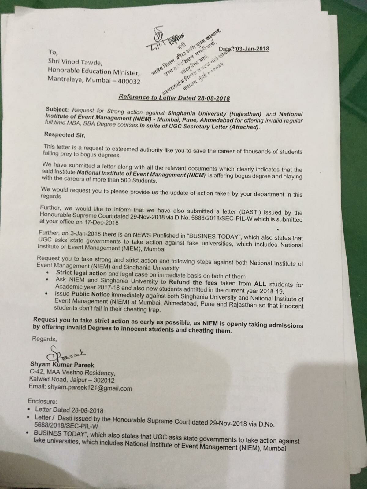 यही नहीं श्याम ने इस कॉलेज के खिलाफ महाराष्ट्र के शिक्षा मंत्री विनोद तावड़े सहित अन्य संबंधित विभागों को भी लेटर लिखा है।
