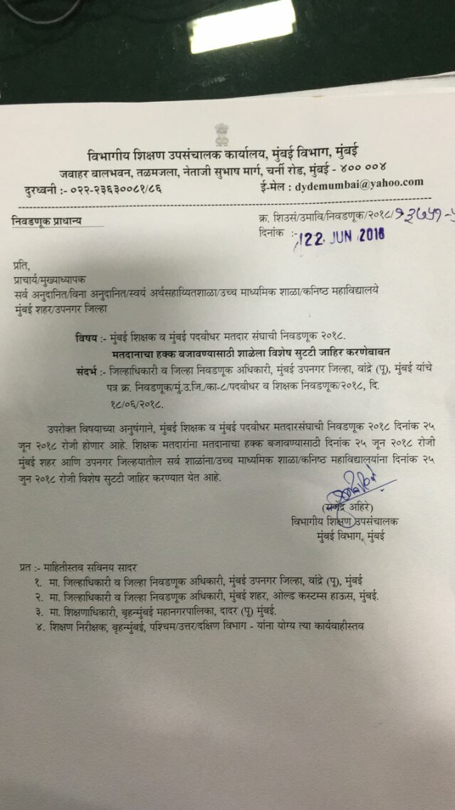 मुंबई शहर और उपनगरों के सभी स्कूलों और जूनियर कॉलेजों में 25 जून को छुट्टी की घोषणा की गई है। शिक्षा विभाग ने इस बाबत एक परिपत्रक भी जारी किया है। । मुंबई शिक्षक और मुंबई ग्रेजुएट निर्वाचन क्षेत्र के लिए 25 जून को मतदान होनेवाले जिसे देखते हुए शिक्षा विभाग ने 25 जून को छुट्टी की घोषणा की है।