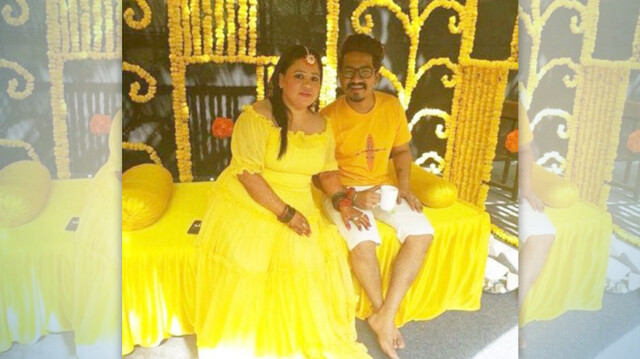 भारती और हर्ष की यह तस्वीर हल्दी के समय की है, दोनों पीले कपड़ों में दिख रहे हैं।
