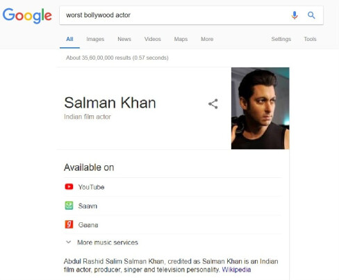 गूगल पर worst bollywood actor टाइप करने पर सलमान खान का नाम आया, जिसका स्क्रीनशॉट लेकर लोगों ने सलमान खान को खूब ट्रेल किया। हालांकि गूगल ने अब इसमें सुधार कर लिया है, जिसके बाद यह टाइप करने पर सलमान खान का नाम और तस्वीर नहीं आ रही है।
