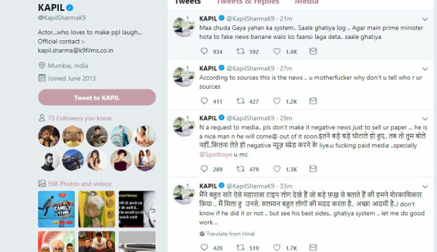 भद्दी गाली देते हुए कपिल तीसरे ट्वीट में लिखा, सूत्रों के हवाले से यह खबर है, सोर्स का नाम क्यों नहीं बताते।