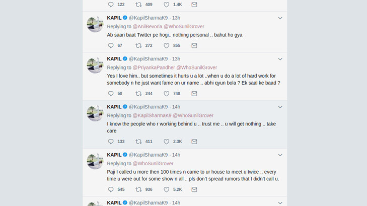 सुनील के इस ट्वीट के बाद कपिल ने भी ट्वीट किया। उन्होंने सुनील को जवाब देते हुए लिखा कि 'पाजी, मैंने आपको 100 बार फोन किया, दो बारा आपके घर भी गया लेकिन बिजी होने के कारण आप नहीं मिले। प्लीज आप यह अफवाह न फैलाएं कि मैंने आपको फोन नहीं किया।'