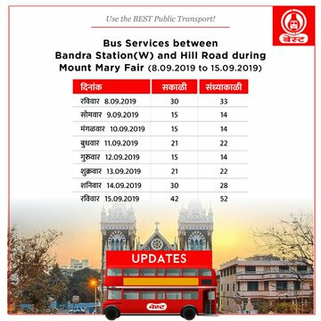 बांद्रा फेयर और गणेश चतुर्थी को देखते हुए बेस्ट ने अतिरिक्त फेरियां चलाने का फैसला किया है। ये फेरियां 8 सितंबर यानी की रविवार से शुरु हुई और 15 सितंबर तक चेलगी।