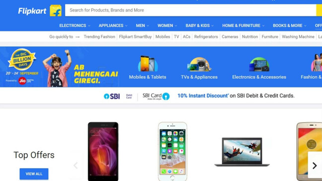 फ्लिपकार्ट ने ‘बिग बिलियन डेज’ के नाम से 20-24 सितंबर तक चलने वाले ऑफर की शुरुआत की है। इस ऑफर में आप ना ही सिर्फ खरिरदारी पर छुट पा सकते है बल्की नो कॉस्ट ईएमआई के जरिए क्रेडिट कार्ड द्वारा बिना एक्सट्रा चार्ज भरे शॉपिंग कर सकते है। कंपनी ने इस बार 10,000 करोड़ रुपये की बिक्री का लक्ष्य रखा है।
