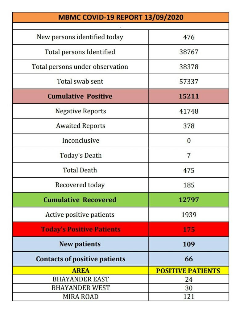 अब तक मीरा-भायंदर में कोरोना के टोटल 15,211 पॉजिटिव केस सामने आ चुके हैं और साथ ही इस बीमारी से अब तक 475 लोगों ने अपनी जान खो दी है।