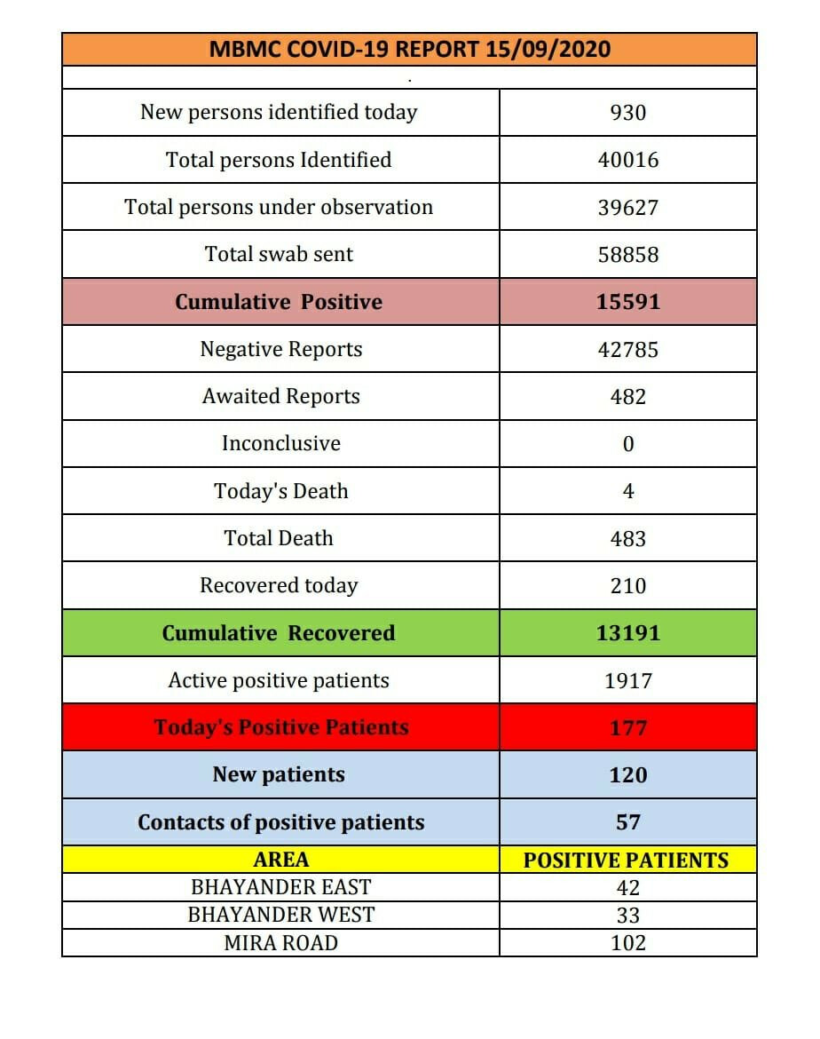 अब तक मीरा-भायंदर में कोरोना के टोटल 15,591 पॉजिटिव केस सामने आ चुके हैं और साथ ही इस बीमारी से अब तक 483 लोगों ने अपनी जान खो दी है।
