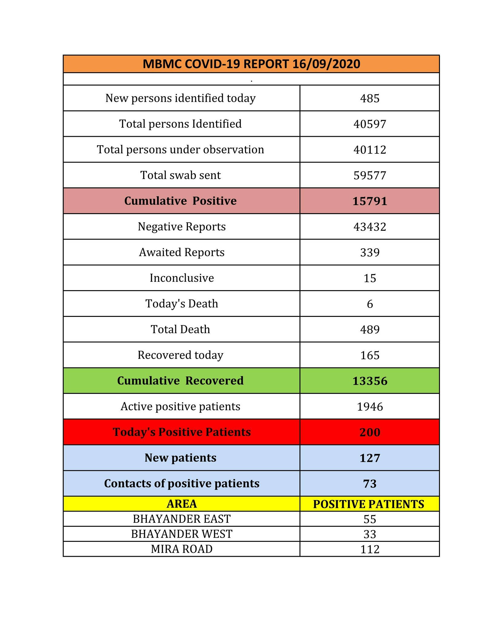 बुधवार को मीरा-भायंदर में 200 नए COVID-19 के केस आने से यह आंकड़ा 15,791 पहुंच गया है। साथ ही इस बीमारी से लोगों की मौत का आंकड़ा 489 पहुंच गया है। बुधवार को इस बीमारी से 165 लोग रिकवर हुए हैं, जिससे अब तक रिकवर हुए लोगों का आंकड़ा 13,356 पार कर चुका है।