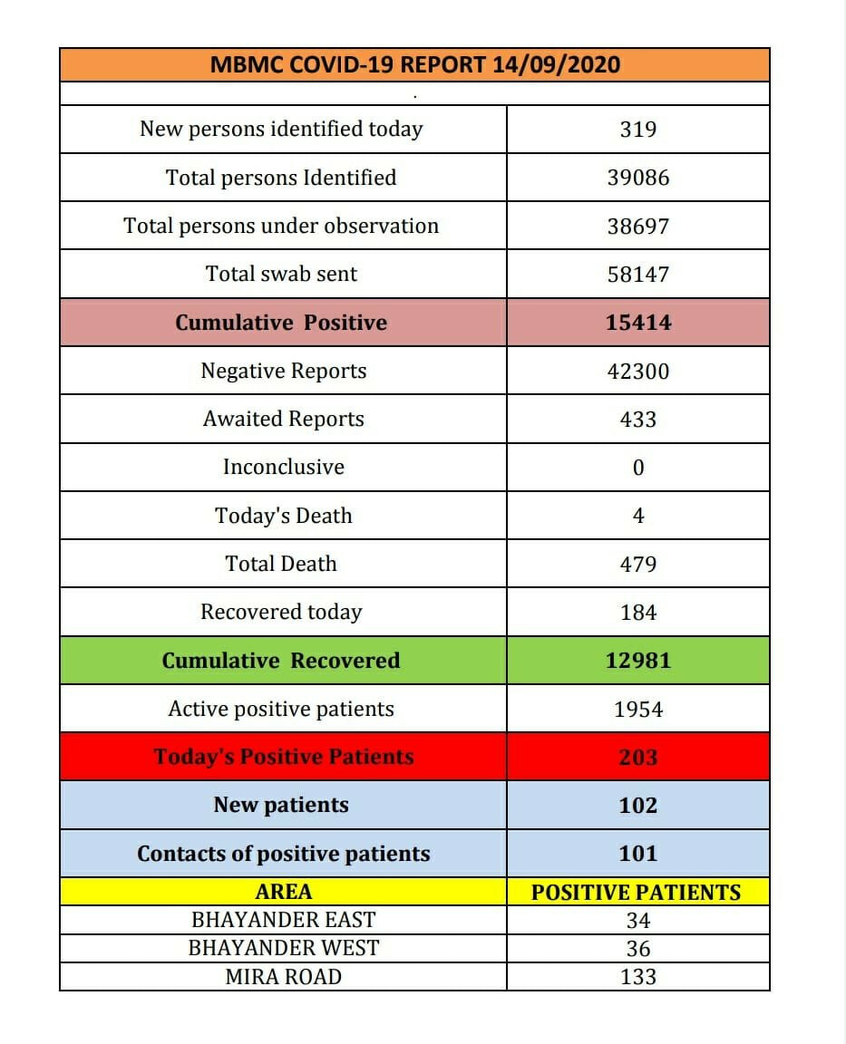 अब तक मीरा-भायंदर में कोरोना के टोटल 15,414 पॉजिटिव केस सामने आ चुके हैं और साथ ही इस बीमारी से अब तक 479 लोगों ने अपनी जान खो दी है।