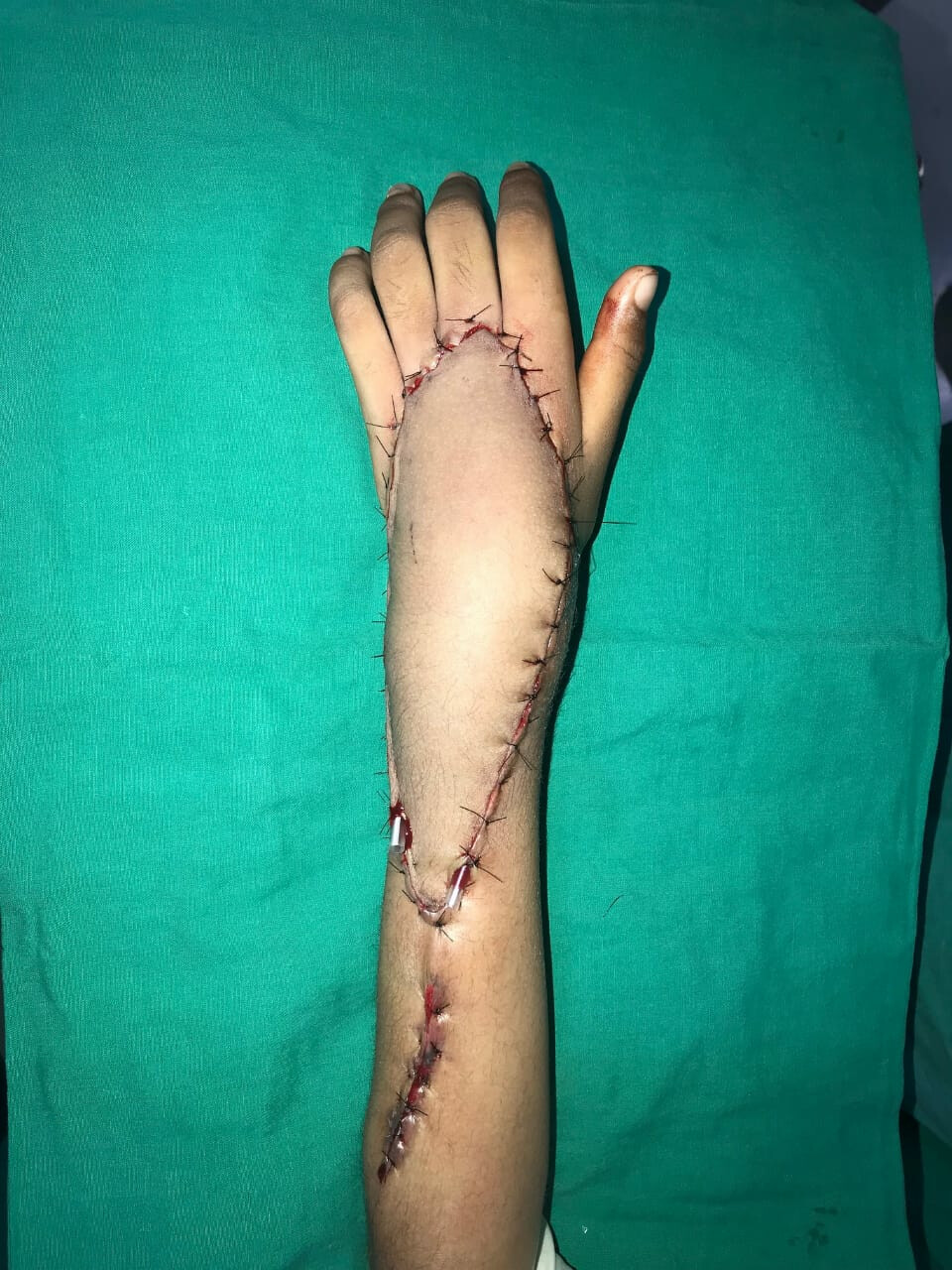 बच्चे का इलाज करनेवाले डॉक्टर और बीजेडब्ल्यूएचसी में हैण्ड एण्ड रीकन्स्ट्रक्क्टिव माइक्रोसर्जन डॉ. नीलेश सतभाई का कहना है की "जब रोगी को मेरे पास लाया गया, तब वह अपने विकृत बाएं हाथ से कोई भी उपयोगी गतिविधि कर पाने में असमर्थ था। घाव बहुत ही गंभीर और बड़ा था,जिसके कारण सर्जरी करने में काफी दिक्कते आई, बायीं जांघ से त्वचा और नरम ऊतकों युक्त एक हिस्से (फ्लैप) को वहां से काटा गया। माइक्रोवस्कुलर तकनीक द्वारा उस हिस्से की रक्त वाहिकाओं को कलाई में स्थित रक्त वाहिकाओं के साथ जोड़ा गया।