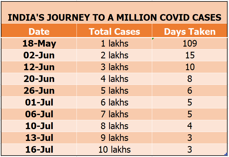 दुनिया भर में फैली महामारी कोरोना वायरस (Covid-19) का कहर लगातार बढ़ता ही जा रहा है। इस मामले में भारत मे भी वृद्धि हुई है। भारत मे कोरोना संक्रमितों की संख्या 10 लाख (one million crossed in india covid-19 case) को पार कर गई। जबकि अब तक 25 हजार से अधिक लोगों की मौत हो चुकी है। इनमें से 70 प्रतिशत संक्रमण के मामले महाराष्ट्र, तमिलनाडु, दिल्ली और गुजरात से हैं।