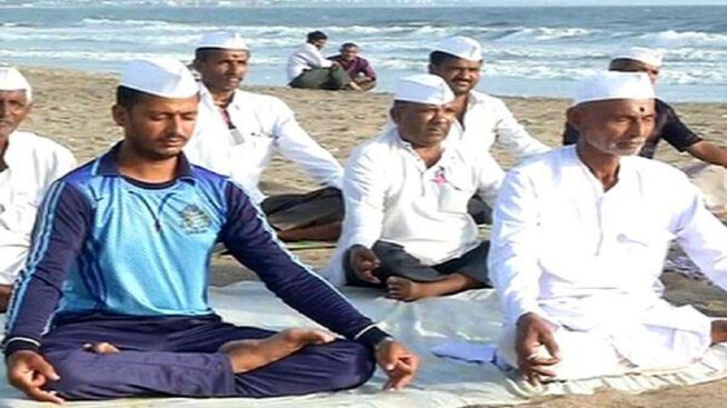 मुंबई में डब्बेवालों ने भी योग डे के मौके पर योग किया।