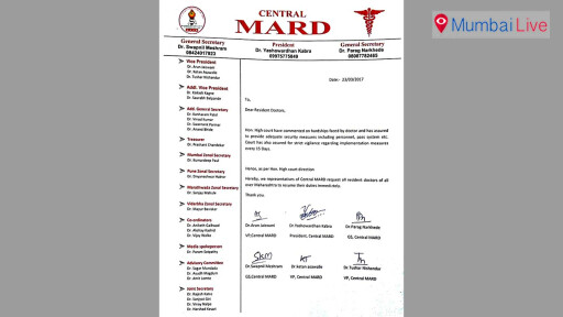 मुंबई - बीते 5 दिनों से शुरु हड़ताल को मार्ड (महाराष्ट्र एसोशिएशन ऑफ रेजिडेंट डॉक्टर) ने पीछे ले लिया है। मुंबई हाईकोर्ट द्वारा डॉक्टरों की सुरक्षा का आदेश दिए जाने के बाद मार्ड नें रेजिडेंट डॉकटर्स को एक पत्र लिखा है, जिसमें उन्होंने डॉक्टरों से काम पर लौटने की अपील की है। पर मार्ड की अपील के बाद भी डॉक्टर काम पर नहीं लौटे हैं।