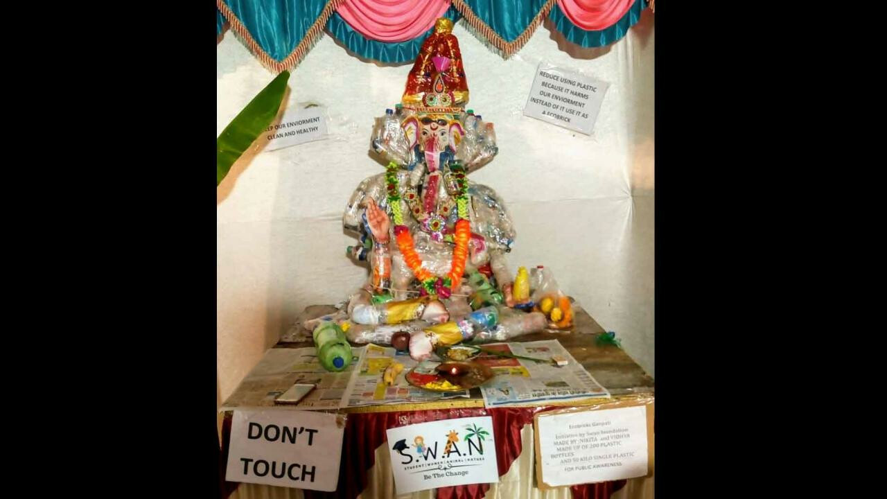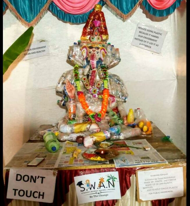 सिंगल यूज प्लास्टिक से पर्यावरण को होने वाले नुकसान के बारे में लोगों में जागरूकता पैदा करने के लिए शिक्षा, पर्यावरण और पशु संरक्षण के लिए काम करने वाले स्वान फाउंडेशन ने 200 बोतलों और 50 किलो सिंगल यूज प्लास्टिक से गणपति बप्पा की प्रतिमा बनाई है। गणपति बप्पा की इस मूर्ति को स्वान फाउंडेशन द्वारा भारत में पहली ईकोब्रिक (प्लास्टिक कचरे से बनी ईंट) का उपयोग करके बनाया गया है।