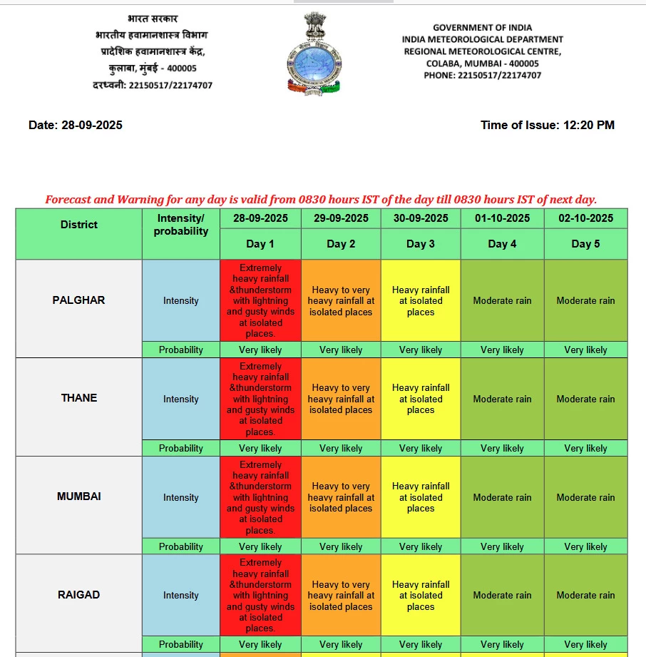 मौसम विभाग ने आज मुंबई महानगर क्षेत्र में भारी बारिश (रेड अलर्ट) और सोमवार, 29 सितंबर, 2025 को भारी बारिश (ऑरेंज अलर्ट) की भविष्यवाणी की है।