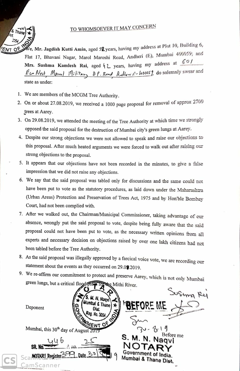 आरे में पेड़ काटने के लोगों के विरोध को देखते हुए मुंबई कांग्रेस अधय्क्ष मिलिंद देवड़ा ने भी बीएमसी में पार्टी के नेता को इस मामले में कोर्ट में एफिडेविट फाइल करने के लिए कहा था। मौजूदा समय में कांग्रेस के रवि राजा बीएमसी मे पार्टी नेता है। रवि राजा ने बॉम्बे हाईकोर्ट में एक एफिडेबिट फाइल की है जिसमें उन्होने बीएमसी के ट्री ऑथिरीटी के इस फैसले पर सवाल उठाया है और बीएमसी कमिश्नर पर लोगों को गुमराह करने का आरोप लगाया है।