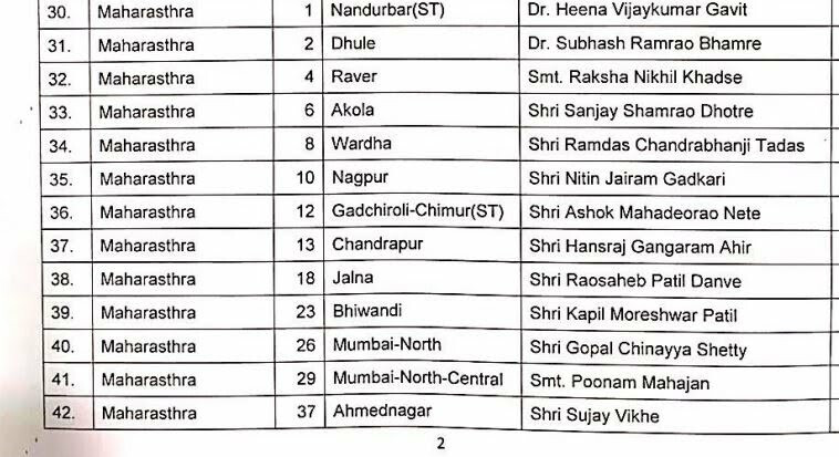 महाराष्ट्र की नागपुर सीट पर फिर से नितिन गडकरी को टिकट दिया गया है तो वही महाराष्ट्र बीजेपी अध्यक्ष राव साहेब दानवे पाटिल को जालना की सीट से पार्टी ने उम्मीदवार बनाया है। अहमदनगर से कांग्रेस नेता राधाकृष्ण विखे पाटिल के बेटे और हालही में बीजेपी में शामिल होनेवले सुजॉय विखे पाटिल को टिकट दिया गया है।