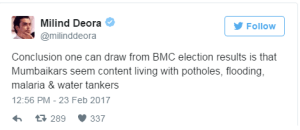 मिलिंद देवड़ा ने कहा, शिवसेना और बीजेपी को बधाई। उम्मीद है मुंबई के अगले पांच साल पिछले दो दशकों से बेहतर होंगे। देवड़ा ने तंज कसते हुए कहा कि बीएससी के नतीजों से लगता है मुंबईकर सड़कों पर गड्ढों, बाढ़, मलेरिया और पानी के टैंकरों के साथ रहने में ही खुशी महसूस करते हैं।