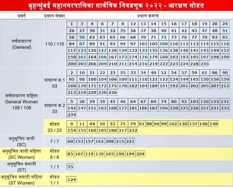 राज्य चुनाव आयोग (SEC) द्वारा जारी कार्यक्रम के अनुसार, आगामी बृहन्मुंबई नगरपालिका निगम (BMC) के लिए 236 वार्ड आरक्षण के बीएमसी (BMC ELECTIONS 2022)की ओर से 31 मई को बांद्रा के रंगशारदा सभागृह में लॉटरी निकाली गई।