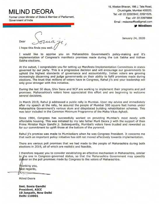 देवड़ा ने पत्र में लिखा है कि मार्च 2019 में जब राहुल गांधी मुंबई में रैली के लिए आए थे तो उन्होंने यहां स्लम इलाकों में रहने वाले लोगों को 500 वर्ग फीट का मकान देने का वादा किया था। लेकिन इसे अभी तक यह पूरा नहीं किया गया। इस वादे को कॉमन मिनिमम प्रोग्राम के तहत भी शामिल किया गया है, लेकिन इसे अभी तक यह पूरा नहीं किया गया।