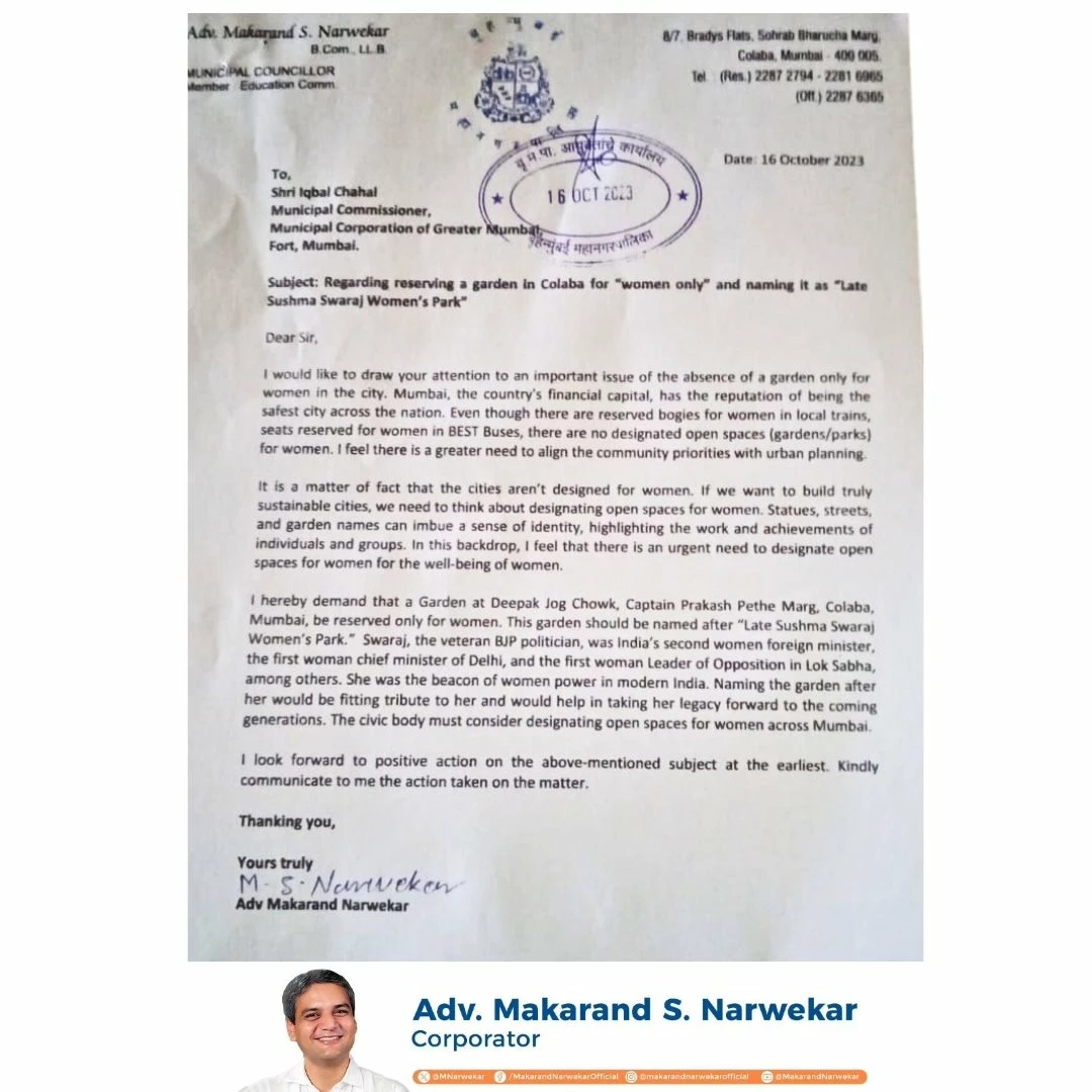 Delighted to present my proposal to @mybmc: The establishment of a "Late Sushma Swaraj Women’s Park" at Deepak Jog Chowk in Colaba. This initiative aims to create dedicated spaces for women, addressing the need for inclusivity in our city planning. Honoring Sushma Swaraj's… pic.twitter.com/6c31mGi2uk