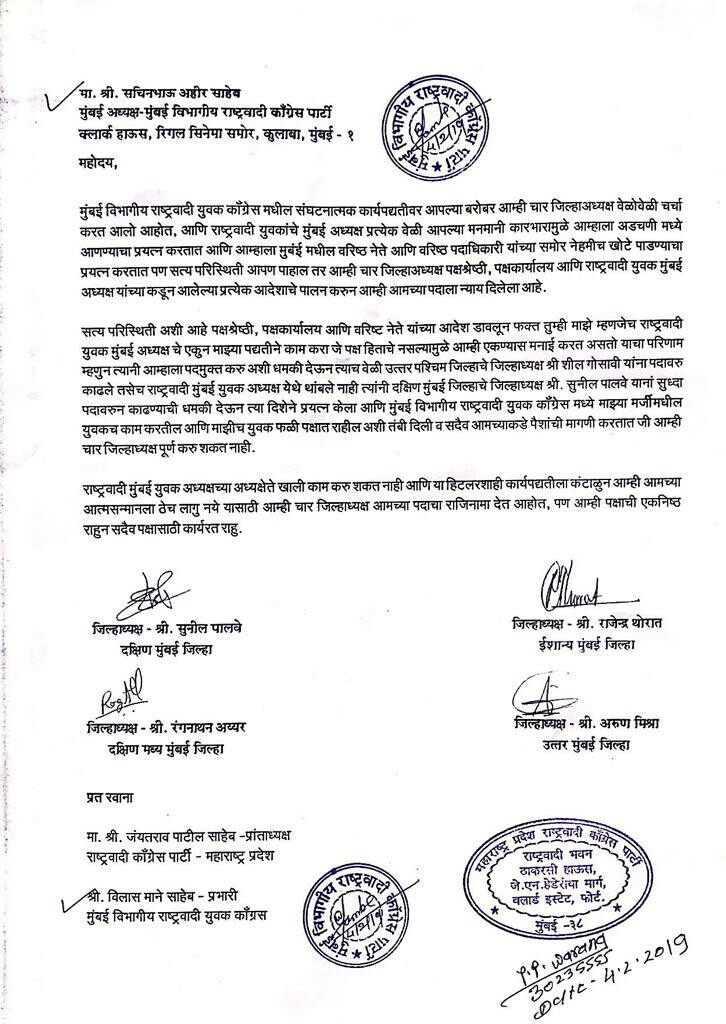 इन चारों जिला अध्यक्षों ने मौजूदा एनसीपी मुंबई युथ अध्यक्ष के नेतृत्व में काम करने से मना कर दिया है। हालांकी चारों जिला अध्यक्षों का इस्तीफा अभी तक स्विकार नहीं किया गया है। इसके साथ ही पार्टी के अालाधिकारियों ने इन चारो जिला अध्यक्षों के बात करने के लिए उन्हे पार्टी दफ्तर बुलाया है।