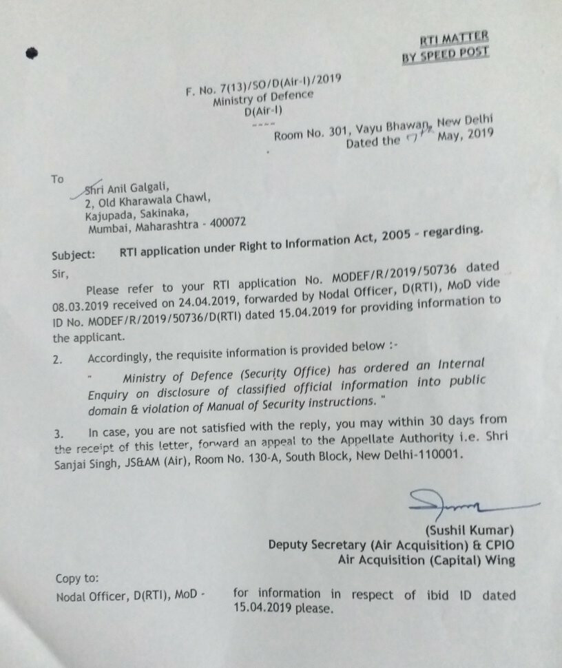 इस आरटीआई का जवाब देते हुए 8 मार्च की रक्षा मंत्रालय के वायु अधिग्रहण के उप सचिव सुशील कुमार ने जवाब दिया कि मंत्रालय ने आंतरिक जांच के आदेश दिए हैं। कुमार ने आगे कहा है कि, “रक्षा मंत्रालय कि सुरक्षा कार्यालय ने गोपनीय आधिकारिक सूचना के सार्वजनिक खुलासे और सुरक्षा निर्देशों की नियमावली के उल्लंघन पर आंतरिक जांच के आदेश दिए हैं।”